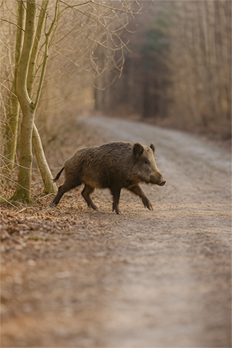 Das Schwarzwild lebt in den hiesigen Wäldern unter großen Laubwäldern mit Bucheckern und Eichelmast. Es fühlt sich hier heimisch und wird wenig gestört. Das Schwarzwild kann reichlich brechen(wühlen) und in schlammigen Tümpeln ausgiebig suhlen. |
